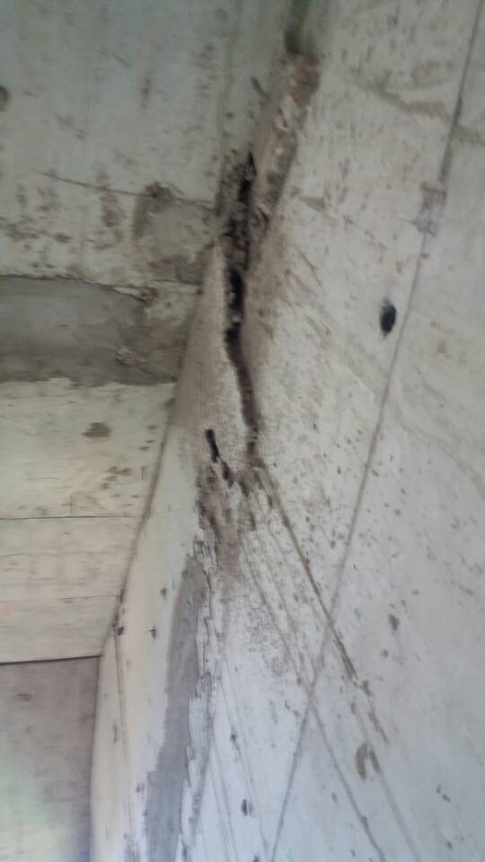 (7)構(gòu)件超載引起的裂紋,例如:構(gòu)件在超出設(shè)計的均布載荷或集中載荷作用下產(chǎn)生內(nèi)力彎矩,出現(xiàn)垂直于構(gòu)件縱軸的裂紋。并上下延伸。