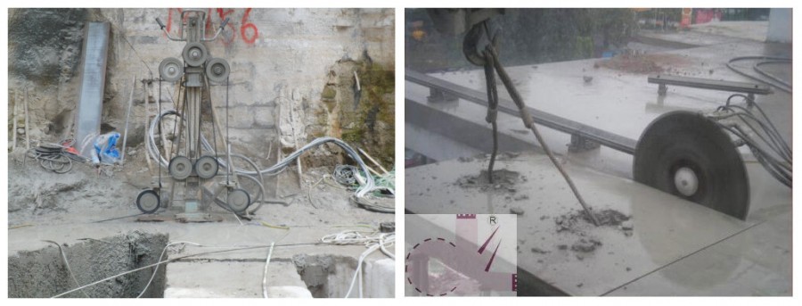 對于原鋼筋混凝土結構,采用金剛石圓盤鋸片切割,將原混凝土完全去除,分段、分塊進行作業,切割切割時控制深度,不切割原始結構。對于原有復雜的混凝土結構,采用金剛石線鋸切割和金剛石桶鋸鉆孔機鉆孔切割相結合的方式。