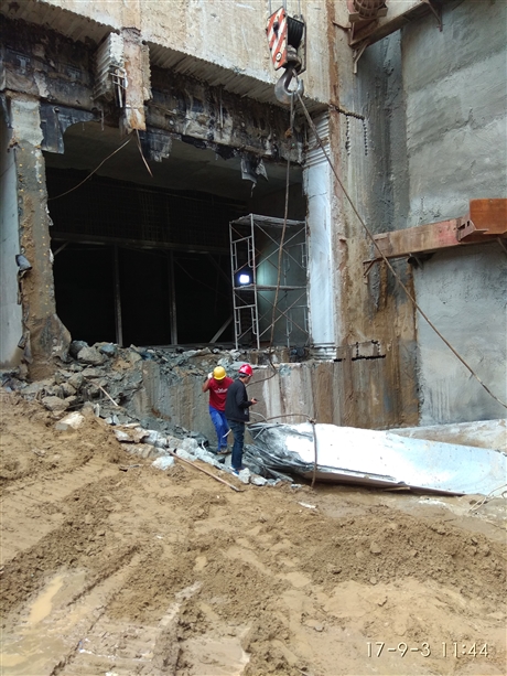 對于原鋼筋混凝土結構,采用金剛石圓盤鋸片切割,將原混凝土完全去除,分段、分塊進行作業,切割時控制深度,不切割原始結構。對于原有復雜的混凝土結構,采用金剛石線鋸切割和金剛石桶鋸鉆孔機鉆孔切割相結合的方式。