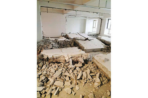 4.拆除樓板:不得損壞或加固樓板,以確保后續施工的安全。混凝土樓板拆除分離后,碾壓到原來的位置,保證拆除不會損壞結構的周邊部分。