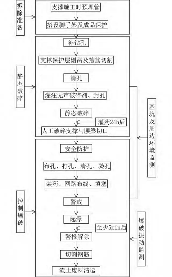 靜爆卸載與明爆破碎相結(jié)合的方法為: 首先靜態(tài)破碎斷開支撐梁與腰梁的連接,使支撐內(nèi)力得到緩慢卸荷,大大減弱了由于爆破作業(yè)產(chǎn)生的振動沖擊; 然后采用控制爆破拆除剩余支撐,拆撐進(jìn)度快;同時在拆撐過程中對基坑及周邊環(huán)境沉降、受力及振動速度進(jìn)行實(shí)時監(jiān)測。