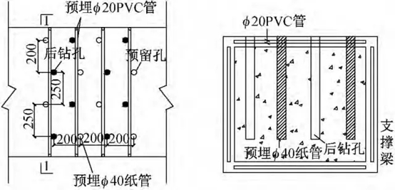 支撐施工時預(yù)埋套管分2 種: 一種是在支撐鋼筋外即在混凝土保護(hù)層內(nèi)預(yù)埋pvc 管,便于下一步人工剔鑿保護(hù)層; 另一種是在設(shè)計孔位置預(yù)埋硬紙管,靜態(tài)破碎或控制爆破時,直接清孔后裝填靜態(tài)膨脹劑或炸藥,如圖4 所示