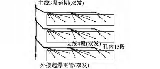 采用2 發(fā)非電雷管直接綁扎6 ~ 7 個炮孔形成1 個單元起爆體,腰梁綁扎3 個炮孔,捆綁時注意聚能穴方向與導(dǎo)爆方向反向; 孔內(nèi)采用高段雷管,孔外主線采用3 段延期、支線采用4 段延期; 起爆時,采用雙激發(fā)針起爆,確保起爆網(wǎng)路的安全。施工中采用同廠、同批次的火工品; 使用前進(jìn)行外觀檢查,確保網(wǎng)路可靠起爆。