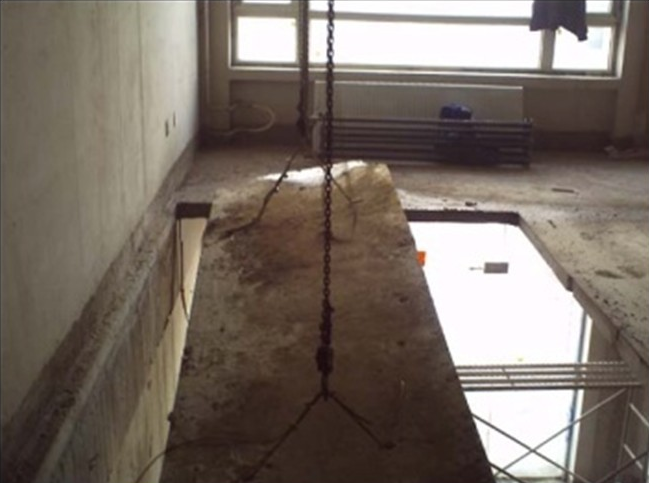 切割完后采用2個(gè)手拉葫蘆將切割好的樓板吊裝輕放至下層樓面或地面。