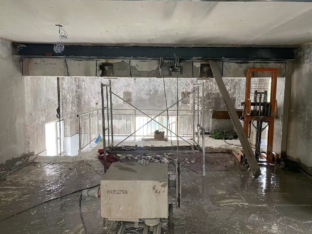 (4)、切割主體結構地板前,用型鋼制作吊裝龍門架,吊架固定在梁上。